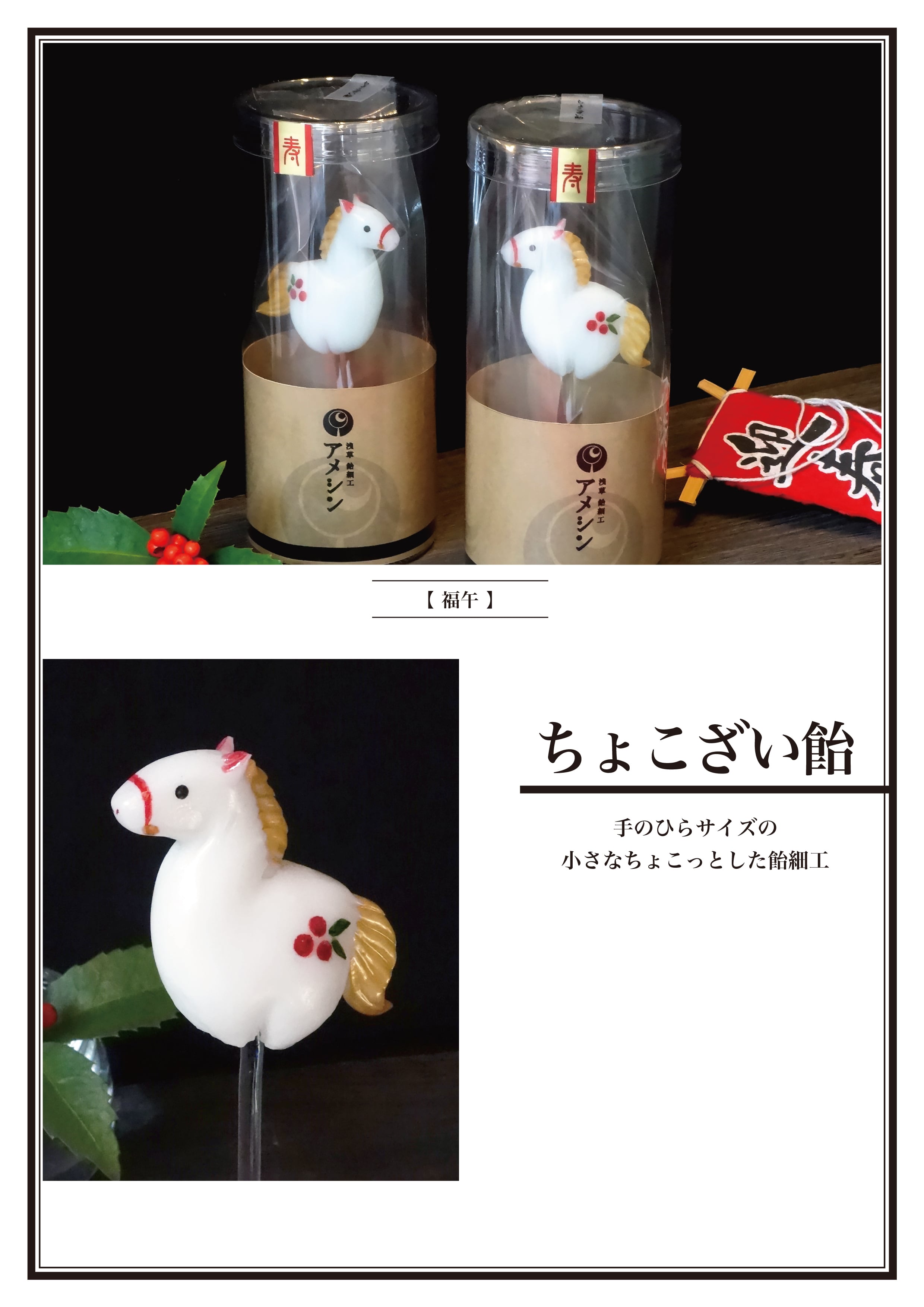 気軽にお手にとっていただけるような、可愛らしい手のひらサイズのちょこっとした飴細工を作りました。お正月限定の干支モチーフで寿シール付きです。