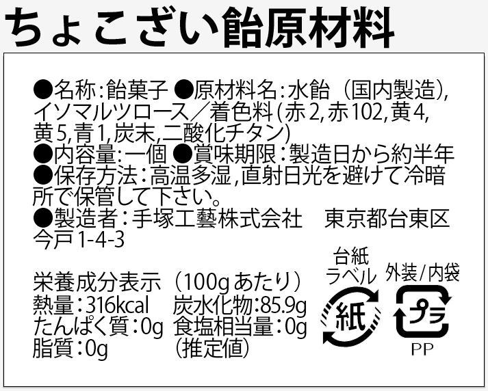 ●原材料名:水飴(国内製造),イソマルツロース/着色料(赤2,赤102,黄4,黄5,青1,炭末,二酸化チタン)