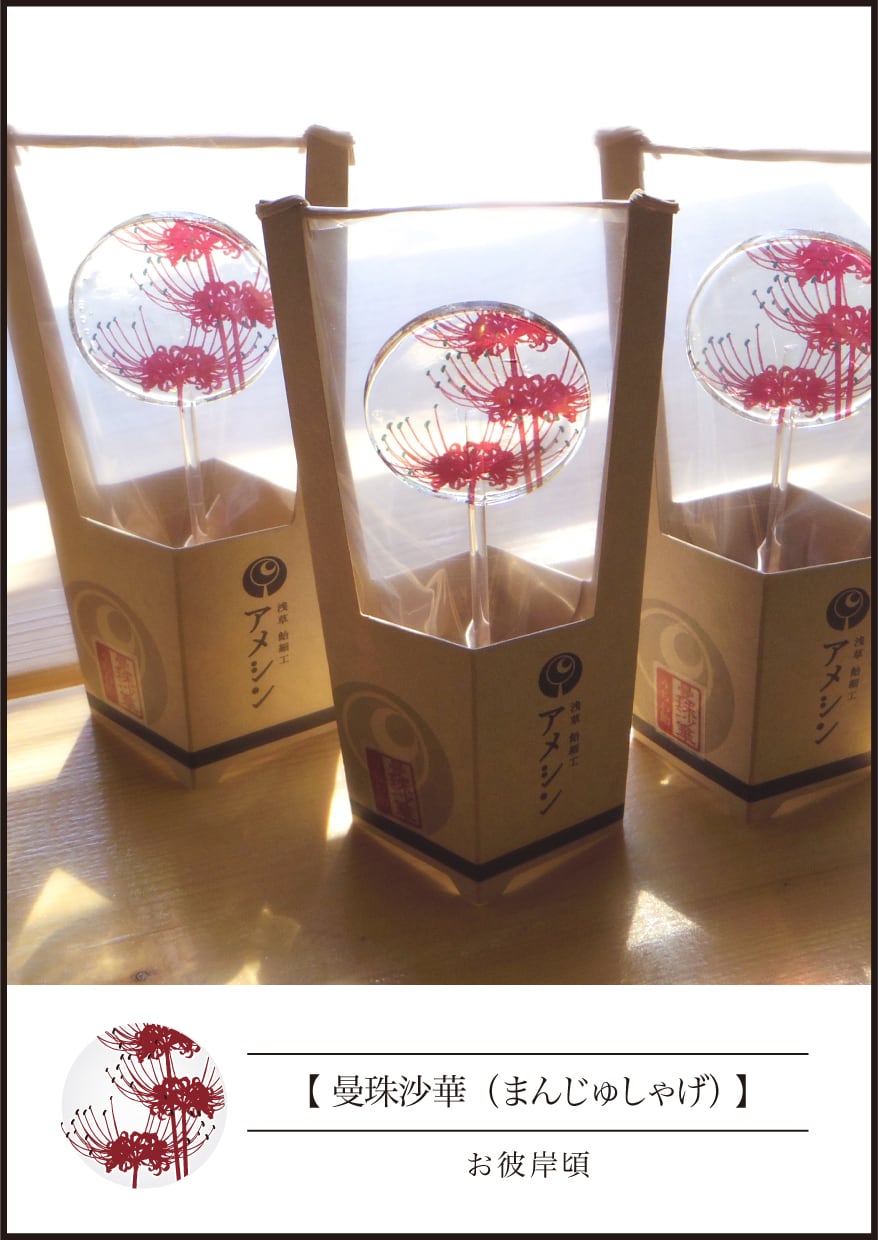 江戸の日常生活に欠かせない「うちわ」をモチーフにしたキャンディーに、伝統的な和柄を施しました。そこはかとなく妖艶な彼岸花、秋頃限定の柄です。