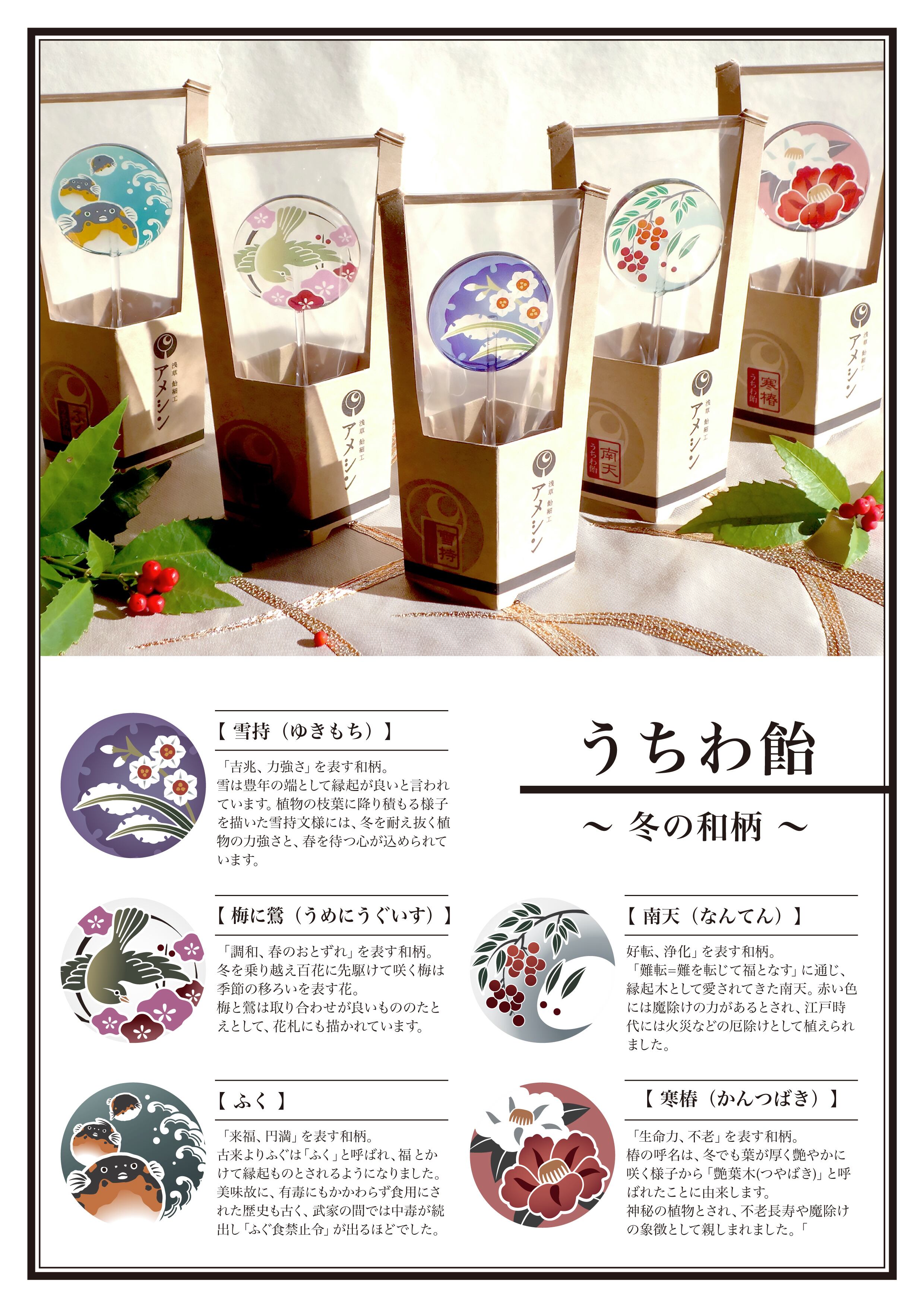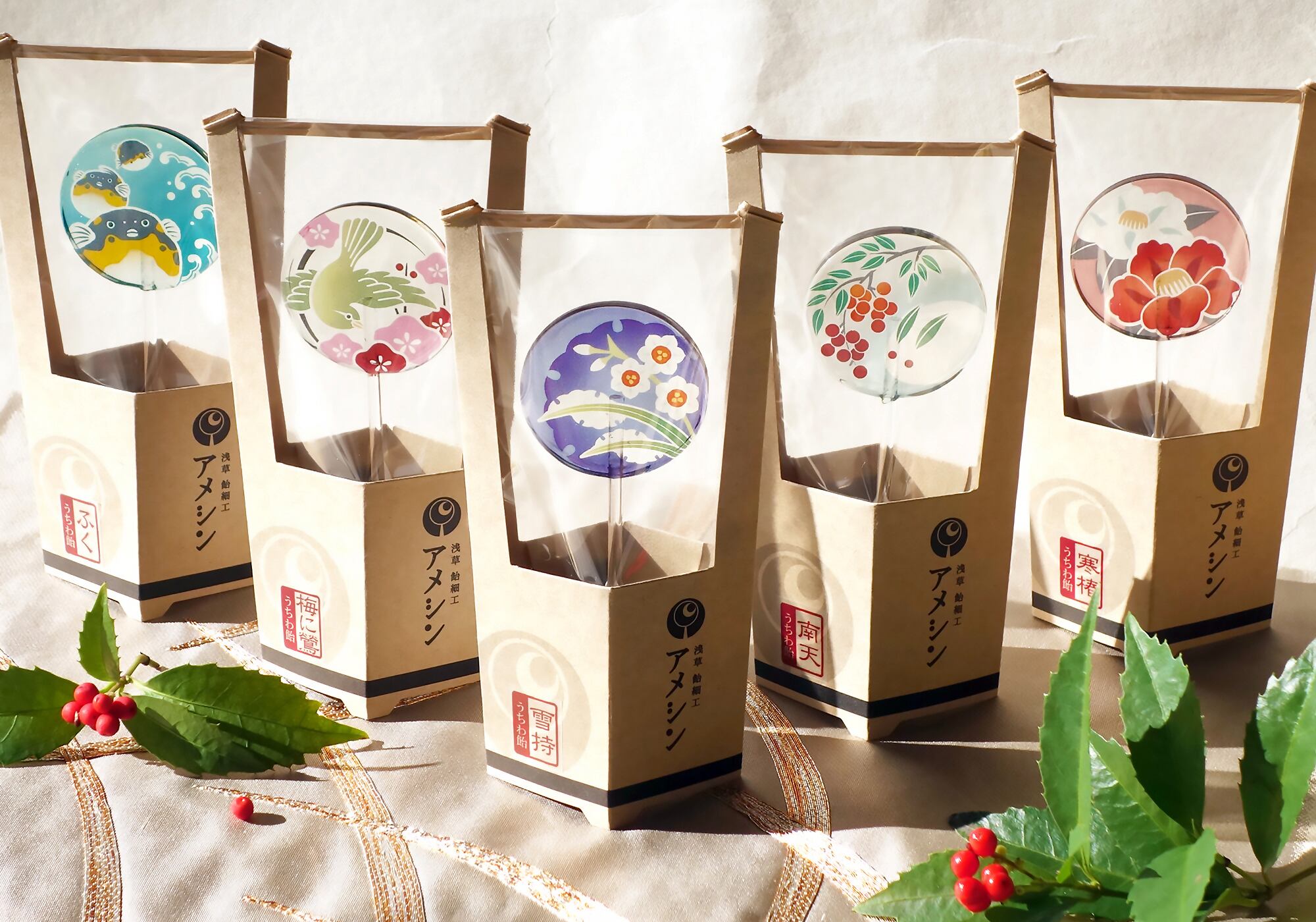 江戸の日常生活に欠かせない「うちわ」をモチーフにしたキャンディーに、伝統的な和柄を施しました。下町観光のお土産としても最適です。